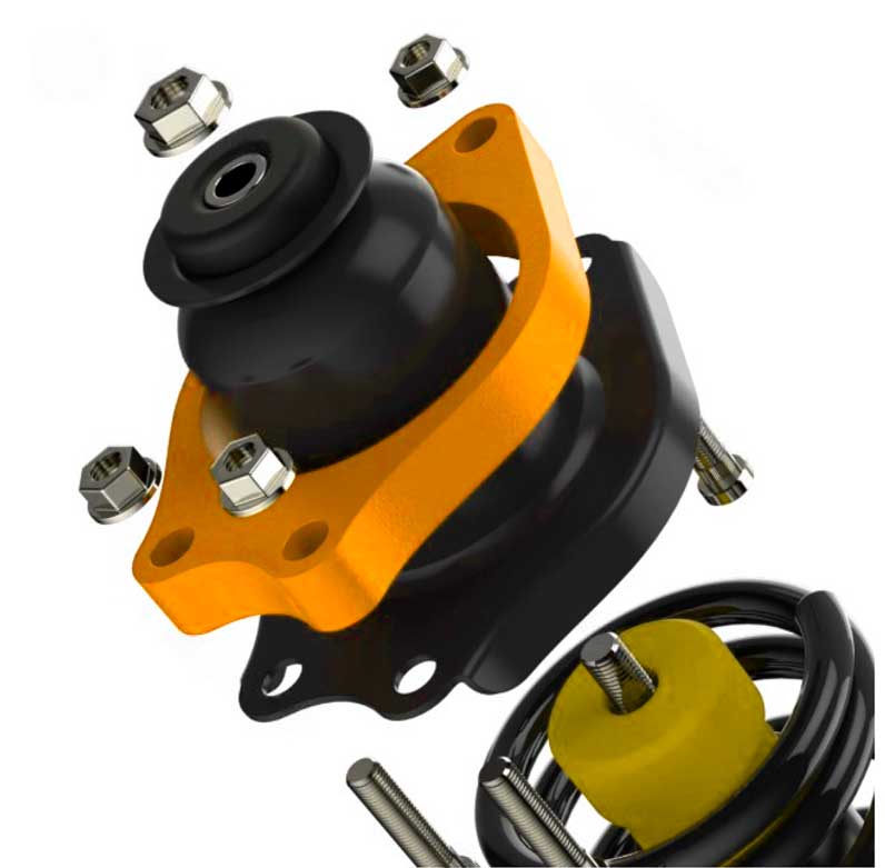 Installed on top of the shock absorber support and bolted into the factory mounts.